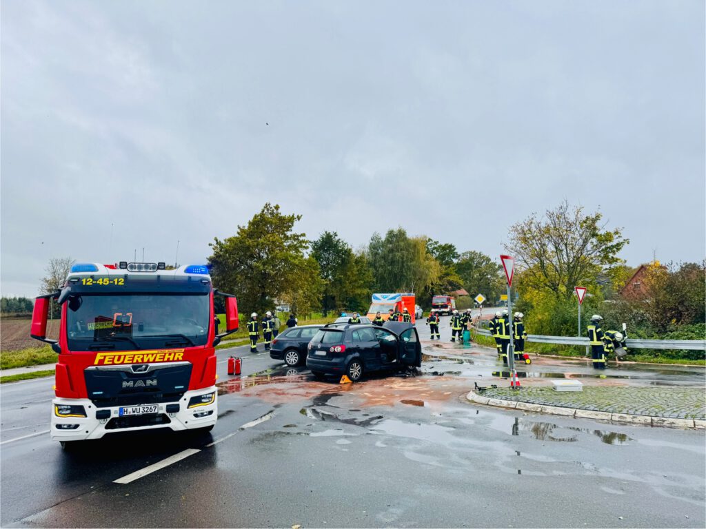 Am Sonntagmittag wurden wir um 11:51 Uhr zu einem Verkehrsunfall auf der K332 am Ortsausgang Großenheidorn in Richtung Poggenhagen alarmiert. Zwei Pkw waren im Kreuzungsbereich frontal zusammengestoßen und wurden dabei stark beschädigt. Beide Fahrer wurden verletzt, vom Rettungsdienst versorgt und eine Person anschließend in ein Krankenhaus transportiert.