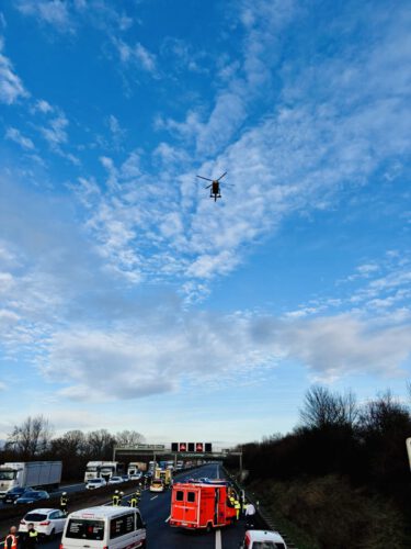 Wir unterstützten als Teil der Einsatzleitung Ort die Gesamteinsatzleitung bei der Koordination der eingesetzten Kräfte sowie bei der Dokumentation des Einsatzgeschehens. Die Feuerwehr übernahm die Absicherung der Unfallstelle, stellte den Brandschutz sicher und unterstützte den Rettungsdienst bei seinen Maßnahmen. Zur Unterstützung landete außerdem der Rettungshubschrauber Christoph 6 auf der Autobahn.
