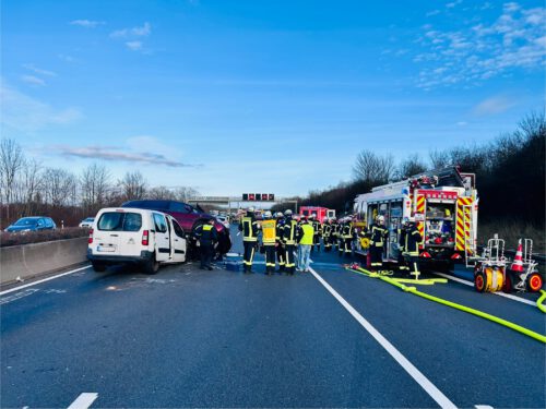 Vor Ort bestätigte sich die gemeldete Lage: Insgesamt waren fünf Pkw in den Verkehrsunfall verwickelt, die teilweise ineinander geschoben oder verkeilt waren. Glücklicherweise war keine Person eingeklemmt. Sechs Personen erlitten leichte Verletzungen. Zwei Betroffene konnten nach der rettungsdienstlichen Versorgung an der Einsatzstelle verbleiben, vier weitere Personen wurden zur weiteren medizinischen Abklärung in umliegende Krankenhäuser transportiert. In einem der beteiligten Fahrzeuge befand sich zudem ein Hund, der ebenfalls betreut wurde.